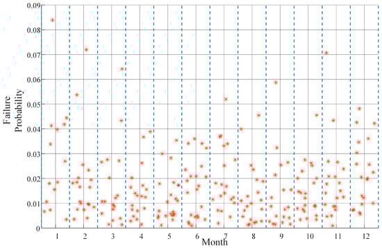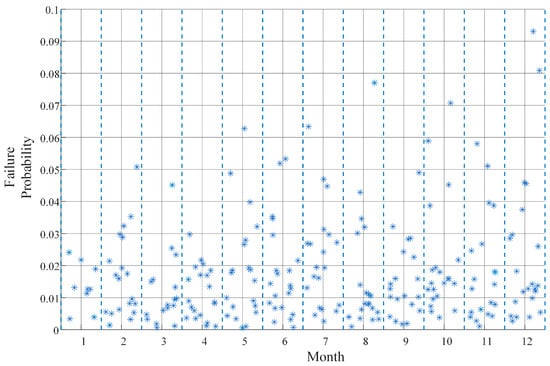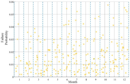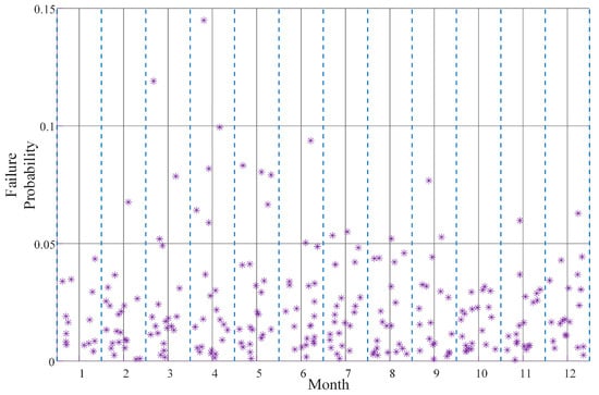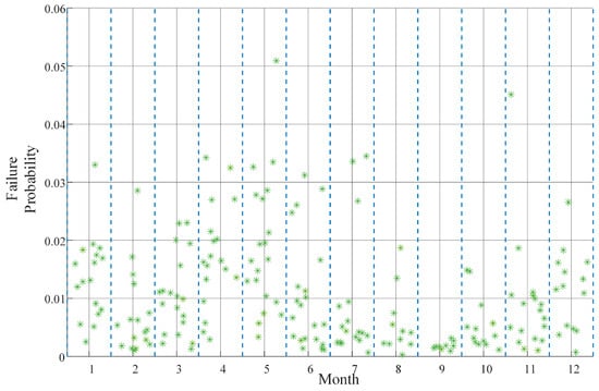 For the Fulong-Fengxian 800 kV HVDC transmission line, it can be observed from Figure 7 that this HVDC transmission line is significantly impacted by wildfire disasters. The failure probability is notably high and concentrated each month. Among them, the probability of failure is higher in March, April, May, June, and September. This means that the periods of HVDC transmission line failures are in the spring and summer. The highest failure probability calculated according to the model is about 0.15 in April. During these months, the focus should be on preventing wildfire disasters.