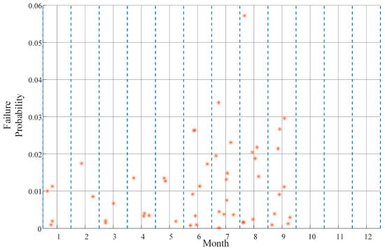 For the Deyang-Baoji 500 kV HVDC transmission line, it can be observed from Figure 6 that the line is less susceptible to wildfire disasters. Although there is a risk of failure, the probability distribution of failure is relatively low. This means that the HVDC transmission line is mostly reliable during most periods of time. Transmission lines operate stably and without failure. Among them, the probability of failure is higher in June, July, and August. Therefore, the period of high failure occurrence for this HVDC transmission line is summer. At the same time, the probability of failure in October, November, and December is 0, indicating no risk of wildfire disaster failure in HVDC transmission lines during the early winter months. The highest failure probability calculated according to the model is about 0.06, which occurs in August. During these months, it is crucial to focus on preventing wildfire disasters.