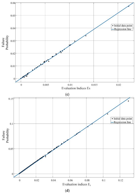 The effectiveness of the evaluation index proposed in this article was verified using linear regression analysis [26,27,28]. The evaluation index was plotted on the horizontal axis, while the failure probability of HVDC transmission lines during wildfire disasters was plotted on the vertical axis. The data scatter points and regression lines of each HVDC transmission line are shown in Figure 10.