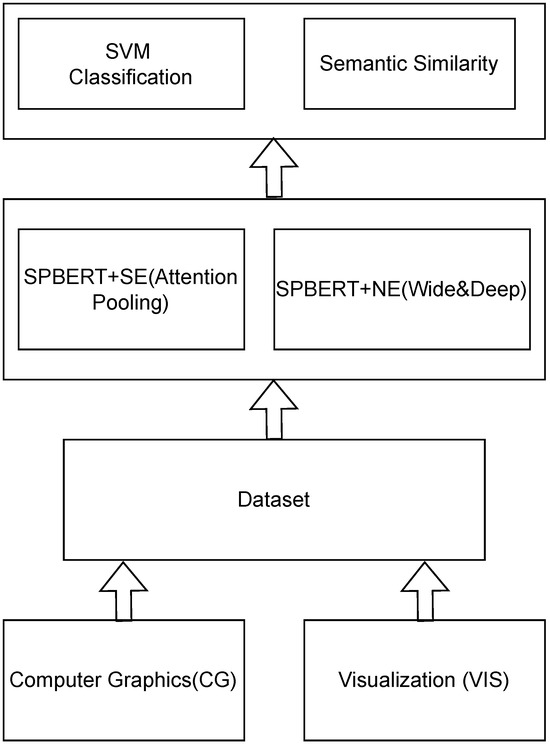 As shown in Figure 2, the SPBERT model is derived from the BERT-Large model, and the model structure and parameters are basically the same (see the description of the Model section below). It uses computer graphics (CG) and visualization (VIS) datasets for self-supervised fine-tuning. It utilizes the class labels in these datasets to generate SE (attention pooling) and NE (wide and deep) feature vector encodings, respectively. The model utilizes a support vector machine (SVM) approach for multi-class supervised learning. After training, the model is suitable for downstream tasks such as classification prediction and recommendation of similar items.