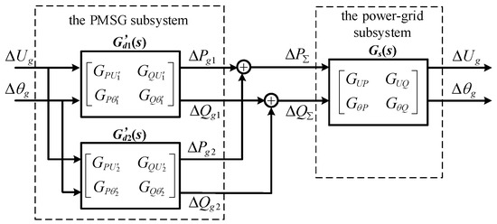 For the PMSG, changes in the amplitude and phase of the terminal voltage will alter the active and reactive power of the PMSG. Therefore, and are the input signals of the PMSG subsystem and and are its output signals. Here, represents the transfer function relationship of the PMSG subsystem. For the power grid, changes in the power injected into the power grid will alter the amplitude and phase of the terminal voltage. Therefore, and become input signals, and and become output signals. Here, represents the transfer function relationship of the power grid subsystem.