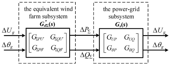 The relationship in (22) represents the excitation–response relationship between the voltage and the output power of the direct-driven wind farm and is the equivalent transfer function matrix for the direct-driven wind farm. The voltage/output power excitation–response relationship after equivalence is shown in Figure 8.
