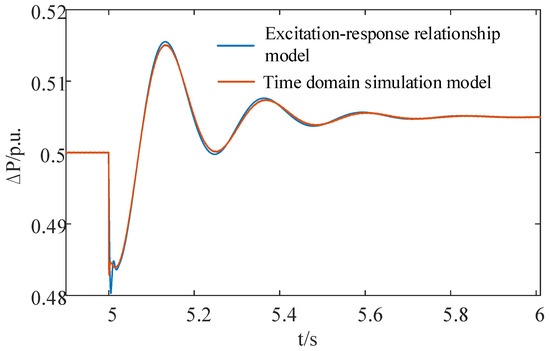 When t = 5 s, the dc-link voltage reference value fluctuates by 1% (from 1200 V to 1212 V). The comparison of the active power curves between the grid-connected PMSG model based on the excitation–response relationship and the time-domain simulation model is shown in Figure 10. The active power response curve for the grid-connected PMSG model based on the excitation–response relationship is highly consistent with the time-domain simulation model, which means that it is highly accurate.