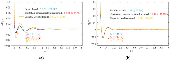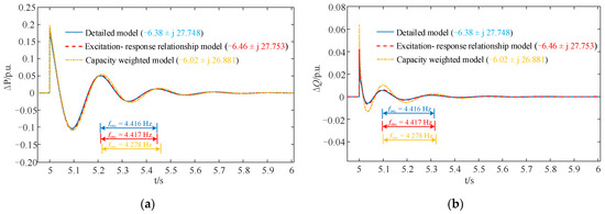Figure 16 shows that when the convergence bus was subjected to voltage phase disturbance, the active and reactive power response curves of the aggregated small-signal model based on excitation–response relationship were highly consistent with the response curves produced by the original detailed small-signal model. A Prony analysis of all the curves in the figure produced the same results as those in Table 2. The proposed aggregation method, based on the excitation–response relationship more accurately reflected the dominant oscillation mode because it considered the differences among the transfer function matrices of each PMSG.