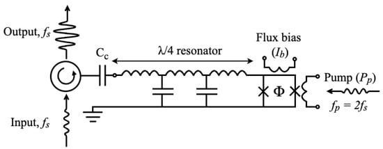 Equivalent circuit diagram of a flux-driven JPA consisting of a coplanar waveguide resonator terminated by a SQUID defined by the Josephson junctions denoted as ×. The inductance of the SQUID is set by the magnetic flux bias which is induced by the bias current () and modulated by the pump signal () at twice the frequency of the signal to parametrically amplify the desired signal. Since the signal input and output share the same port, a circulator is required to regulate the direction.