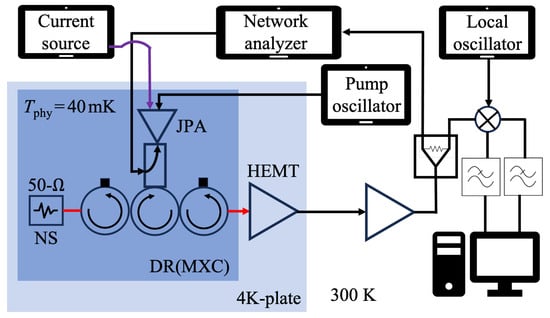 where represents the physical temperature of the test system and h denotes the Planck constant. A typical readout chain consists of a multistage amplifier and the total noise is primarily dominated by the noise figure of its first stage amplifier according to Friis’s formula [18], requiring a low-noise amplifier is placed at the first stage of a receiver chain. Since an axion search experiment needs to scan a certain frequency range, the cavity and the amplifier are required to be tunable, and so is the amplifier. For these reasons, a tunable superconducting amplifier, such as a Josephson Parametric Amplifier (JPA) [19], is suitable for the first amplification stage [20,21,22,23,24,25,26]. The minimum value of each noise component is governed by the uncertainty principle, quantified as half of the photon noise, resulting in the standard quantum limit of system noise for phase-insensitive detection, expressed as . Due to their high gain, low noise, and tunable operation, flux-driven JPAs are used in various applications requiring low-noise amplification [27,28,29,30,31,32,33].