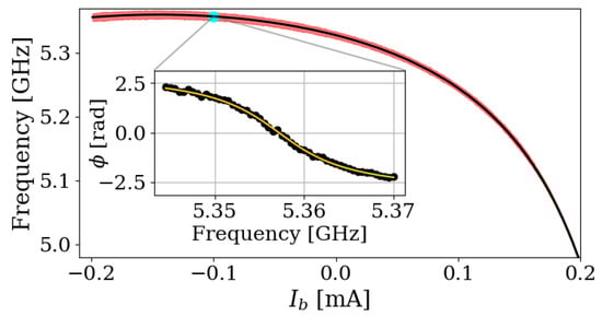 Passive resonant frequency of the JPA as a function of flux bias (), with the red band representing the bandwidth. The inset provides an example of the phase response fitted with the arc-tangent transfer function (in yellow), given in Equation (3), at mA.