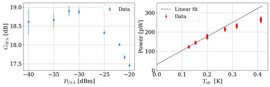 JPAs rely on the nonlinearity in the Josephson junction, meaning the gain of the JPA changes with variations in the amplitude of input signals. Exceeding certain input power levels leads to junction saturation, which reduces the JPA gain and distorts the output signal, thus limiting dynamic range and linearity. Therefore, maintaining the input power at appropriate levels is crucial for optimizing JPA performance and preventing saturation. This requires a precise understanding of the saturation power to ensure linear operation within the optimal range. Such power saturation issues may arise in certain measurement processes, e.g., JPA gain measurement via transmission measurements using a VNA and noise figure evaluation through the Y-factor method involving a noise source. The saturation power of our JPA was independently estimated using the following methods. The JPA gain, determined as the ratio between output signals in the JPA on and off states, was calculated across a range of VNA output power levels spanning from −40 dBm to −20 dBm. In the Y-factor measurement, noise power was acquired at various physical temperatures of the noise source, ranging from 40 mK to 500 mK. These measurements were performed at a half pump frequency of 5.23 GHz, and the results are shown in Figure 4. A gradual decrease in gain is evident at high VNA output powers, and the non-linearity becomes apparent at high noise temperatures. Based on these findings, the acceptable maximum VNA power and NS temperature for reliable JPA operation were found to be about −30 dBm and 200 mK, respectively. These numbers consistently indicate that the saturation power of the JPA is approximately −140 dBm, accounting for all attenuation from upstream components in our measurement setup and considering the typical JPA bandwidth of around 1 MHz. The Y-factor technique using the data points up to 200 mK resulted in a JPA gain and system noise temperature of dB and mK, respectively. The obtained gain coincides with that acquired using the VNA, validating the saturation power measurements.