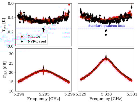 Comparison of noise temperature (top row) and gain (bottom row) measurements of the JPA using both NVR-based (black) and Y-factor (red) methods under two different operating conditions. Deviations in data points at the half pump frequency are attributed to signal–idler degeneracy. Both measurement techniques exhibit a mutual agreement within 2%.