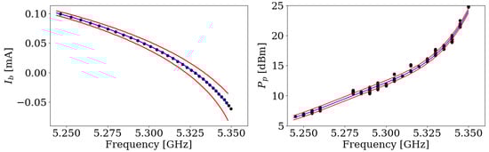The operation of JPAs typically relies on adjusting two main parameters: (i) bias current to tune the JPA frequency, and (ii) pump power to achieve parametric amplification of signals. These two parameters are crucial for controlling the behavior and performance of JPAs, allowing for the optimization of key characteristics such as gain, bandwidth, and noise figure. In order to establish the initial simplex for the NM algorithm at a given resonant frequency, these parameters need to be pre-measured and parameterized as a function of frequency. The bias current is swept to obtain a profile of the JPA passive resonance frequency as a function of the bias current, as discussed in Section 2.3. This process involves varying the bias current to observe changes in JPA resonance, thereby mapping out the tunable range of the JPA and identifying the bias current values corresponding to the desired resonant frequencies. The pump power was also swept to acquire a set of values that yielded a JPA gain of dB using the VNA. This step entails systematically adjusting the pump power while monitoring the resulting gain to identify the optimal pump power for each frequency. These two parameters were parameterized by fitting the acquired data points as a function of frequency, as shown in Figure 6. The fitting function for the passive resonance curve was derived from Ref. [43], which models the response of the SQUID inductance to the bias current through an equivalent LC circuit: