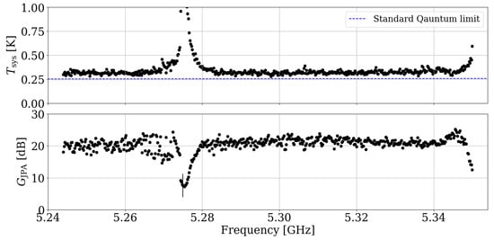 System noise temperature (top) and JPA gain (bottom) found by the NM algorithm as a function of frequency. The blue dashed line represents the standard quantum limit. The anomalous behavior observed around 5.275 GHz and 5.35 GHz is presumably attributed to impedance mismatch and maximum resonant frequency, respectively.