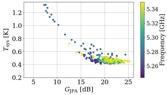 Correlation between the system noise temperature and JPA gain derived from the data presented in Figure 8.