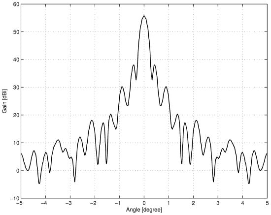 It should be noted that the power of the received signal is related to the beam alignment error and the distance between the transmitter and receiver. For terahertz communications systems equipped with narrow beam antennas, the antenna gain is quite sensitive to beam misalignment, the impact of which is dominant on the received signal power, especially for long-distance scenarios. For example, considering an initial distance of 1000 m between the transmitter and receiver, and referring to a commercial terahertz Cassegrain antenna [37], for which the beam pattern is illustrated in Figure 1 and the half-power beamwidth (HPBW) is 0.2 degrees, when the receiver moves 1.7 m away vertically from the initial direction from the transmitter to the receiver, the beam alignment error changes by 0.1 degrees and the antenna gain decreases by 3 dB, while the path loss change due to distance is only dB.