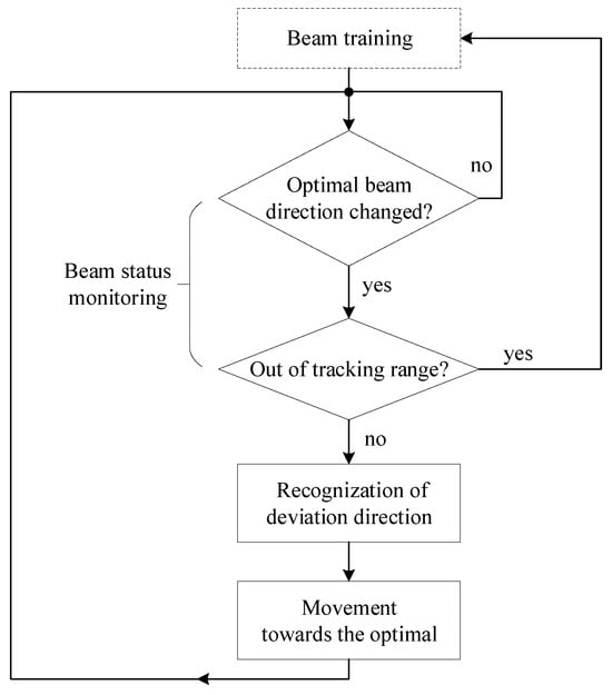 In order to narrow down the scanning range of candidate directions to reduce the sounding overhead and improve efficiency, we propose a novel beam tracking procedure using power measurement. Figure 2 shows a block diagram in which beam training for initial beam alignment is mentioned for completeness. Considering that beam tracking is applied after successful beam alignment through beam training, our proposed procedure starts with beam status monitoring by observing the received power to check whether the optimal beam angle has changed, which means that the current beam angle is no longer optimal. Until the optimal angle changes, beam status monitoring continues, and other components are not triggered. When the checking result shows that the optimal angle has changed, beam status monitoring additionally determines whether the optimal beam angle is out of the tracking range, which indicates the tracking ability of this procedure. If it is, the beam tracking procedure is interrupted, and beam training with a wider scanning range should be performed. Otherwise, the beam tracking procedure continues, and the deviation direction is recognized, through testing candidate directions and comparing the corresponding received power variations. The recognition result of the deviation direction can be none, clockwise, or anticlockwise, which means that the beam does not need to be rotated or should be turned clockwise or anticlockwise, respectively. Then, the beam angle is adjusted accordingly until the optimal angle is reached, followed by repeated beam tracking procedures starting with beam status monitoring.
