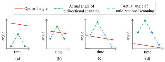 - In case (b), there are intersections between the optimal and actual beam angles during bidirectional scanning, as illustrated in Figure 3b. Since the actual angle is always close to the optimal angle, the value of is approximately zero. In this case, the actual angle does not need to be adjusted, and the deviation direction can be regarded as none.