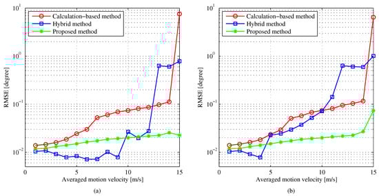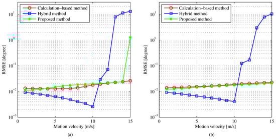 First, we simulate the motion scenario with a fixed velocity, where the motion direction does not change and is perpendicular to the initial direction from the transmitter to the receiver. The total simulation time T is 30 s. Performance is evaluated in terms of the root-mean-square error (RMSE) averaged over 500 trials of random noise. For each trial, the RMSE is defined as , where is the number of time samples with equal intervals . Figure 4 depicts the simulation results for two different motion directions. For each motion velocity, the scanning period used in the calculation-based method is set to 30 ms, and the corresponding averaged scanning speed can be obtained as , where L denotes the number of scans and represents the total angular change during the scan. Accordingly, the performance of the hybrid method and that of our proposed method are evaluated with this scanning speed. It should be noted that the scanning speeds for different motion velocities vary because the scanning ranges predicted by the calculation-based method differ. In contrast, the scanning speeds for different tracking methods are the same for each motion velocity within a specific motion direction.
