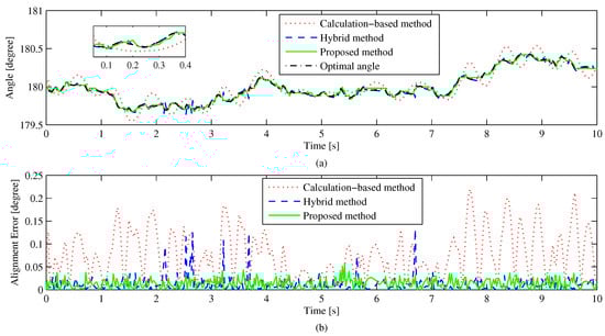 Finally, we simulate the random motion scenario, where the moving direction randomly changes following a uniform distribution ranging from 0 degrees to 360 degrees, and the motion velocity randomly changes following a uniform distribution ranging from 0 m/s to 30 m/s. In order to track this random motion, the scanning period used in the calculation-based method is set to 10 ms, resulting in a corresponding scanning speed of about 8 degree/s. Figure 6 shows a tracking example over a 10 s simulation time, illustrating the variation in the beam angle due to random motion and the corresponding beam alignment error.