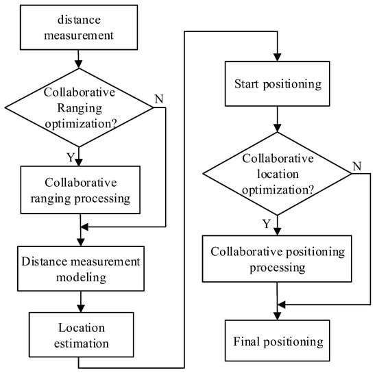 Distributed optimization collaborative localization usually includes two algorithm-implementation steps: node self-localization and information fusion collaboration. The process of information fusion collaborative positioning is based on the basis that observation information measurement between nodes has been implemented in each node in the network, and the unknown nodes that have realized the location receive the location information and observation information of the neighbor nodes, by fusion information and information interaction with the neighbor nodes, and then a certain collaborative location algorithm is implemented to obtain more accurate location information of the unknown nodes. The distributed optimization and collaborative localization process is shown in Figure 1.