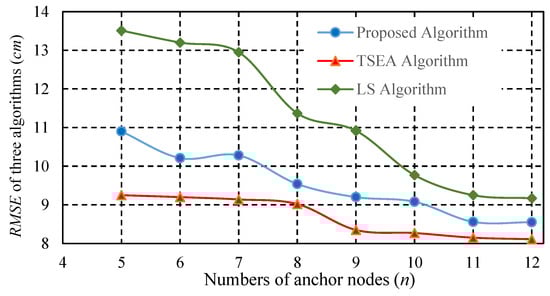 We set the total number of nodes in the network to 100; set the communication radius of nodes to 20 m; set the variance of ranging error to 7; and set the number of anchor nodes to 5, 6, 7, 8, 9, 10, 11, and 12 in turn. The comparison of RMSE results obtained from the three algorithms is shown in Figure 2.