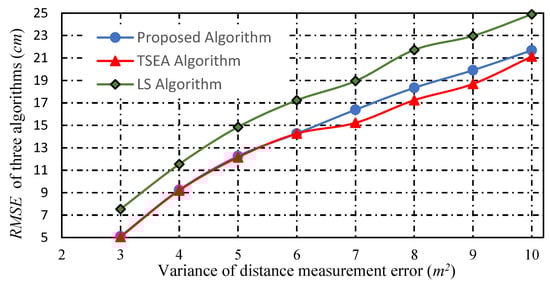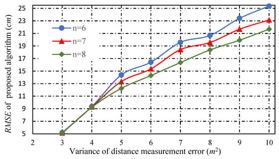 From the trend of three positioning error curves in Figure 4, we can see that, with the increase in the number of anchor nodes, the positioning error of the proposed algorithm decreases continuously, and the positioning effect is getting better. The reason is that the increase in the number of anchor nodes makes the information involved in positioning increase, and the result of the localization algorithm is closer to the actual value. As the variance of ranging error increases gradually in each curve, the positioning error of the proposed algorithm increases continuously. We can also see that the positioning error rises fastest when the number of anchor nodes is 6, and the positioning error rises slowly when the number of anchor nodes is 8. Therefore, the position information provided by anchor nodes is of great significance to improve the positioning accuracy; when conditions permit, increasing anchor nodes can improve positioning accuracy.