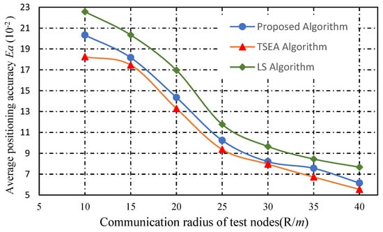 From Figure 5, we can see that, with the increase in the communication radius of the nodes, the positioning error of the three algorithms decreases, which is due to the increase in the communication radius; the increase in the anchor nodes involved in the positioning promotes the improvement of the positioning precision. However, the precision of the LS algorithm improved slowly, the proposed algorithm was close to the TSEA algorithm, and the positioning precision improved rapidly, and the proposed algorithm is always better than the LS algorithm at the same communication radius. The reason is that the RSSI distance error correction is carried out to the proposed algorithm, the ranging error is reduced, and the anchor node selection measure is implemented; hence, the positioning precision is higher than that of LS algorithm.