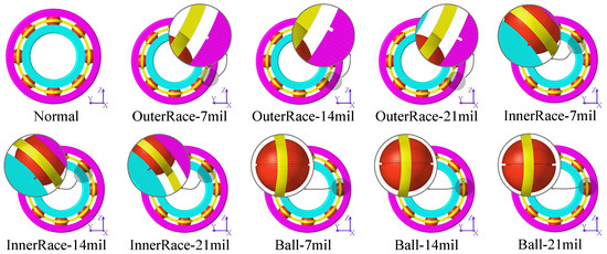 The experimental bearing failure manifested itself as grooves produced by electrical discharge machining (EDM) and this simulation mimics the same artificial damage as the experiment. The finite element model was meshed using Hypermesh software (version:2021.2) so that each mesh width was 7 mil. Bearing failures of different sizes exhibited grooves with a circumferential length of 7 mil and an axial depth of 7–21 mil.