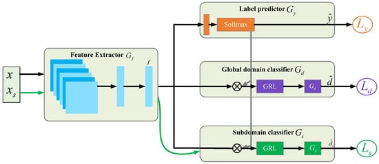 The global domain classifier adversarial loss was used to reduce the difference between the source and target domains in the feature space. Still, it may misalign different kinds of bearing health state features, resulting in negative migration. The subdomain classifier adversarial loss is used to align the distribution of samples of the same type from different domains, updating parameters