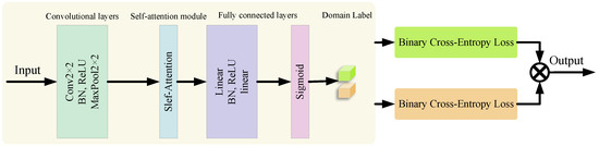 Figure 5. The global domain classifier and subdomain classifier use the same network structure to distinguish whether the inputs belong to the same domain or not. The domain classifier contains Convolutional Layers, a Self-Attention Module, and Fully Connected Layers. Its output is compared with the real domain label to calculate the binary cross-entropy loss. The binary cross-entropy loss is calculated by comparing the output of the domain classifier with the real domain labels.