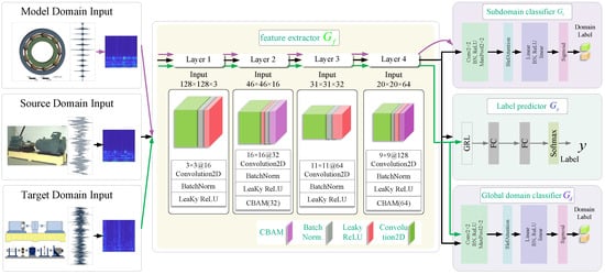 In each epoch, the feature extractor processes the source domain samples. Then, the label predictor’s loss , the global domain classifier’s loss in comparison with the source domain samples, and the subdomain classifier’s loss in comparison with the model domain samples are computed.