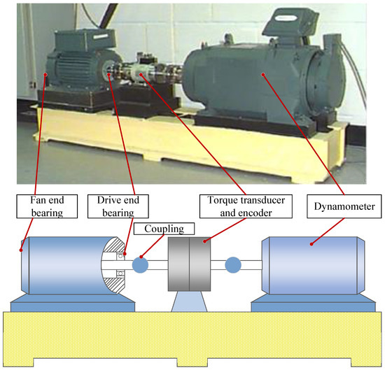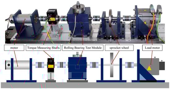 Figure 7 displays the test rig, which comprises several modules arranged from left to right: motor, torque measuring shaft, rolling bearing test module, flywheel, and load motor. The test bearing model is a 6203 rolling bearing and the vibration signals are sampled at 64 KHz. The signals contain three health conditions: normal, internal fault, and external fault.