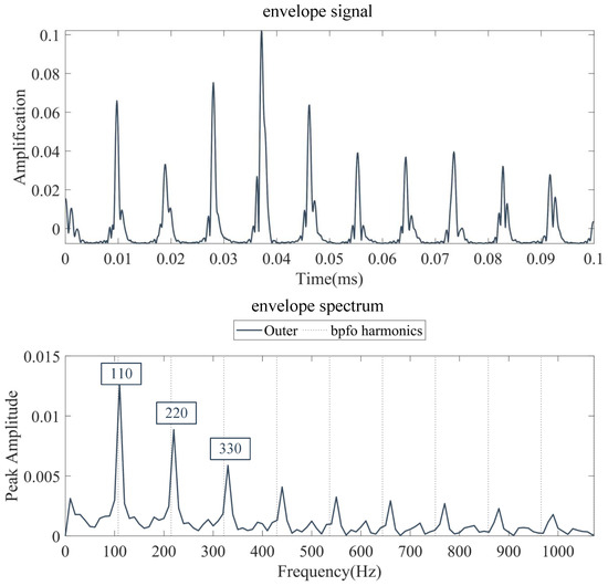 Figure 10 displays the envelope signals of the vibration acceleration signals and their spectra collected when the rotary axis has an angular velocity of 1796 rad/min and a radial force of 2000 N.
