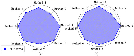 When comparing Method 1 with Methods 2–5, it is evident that Method 1 has a higher average accuracy and a lower standard error of the mean. In unsupervised scenarios, the method of learning demonstrates stronger generalization capabilities. Methods 2 and 3 can be considered models trained on the source domain, directly predicting the target domain. These methods show better post-transfer results in terms of accuracy, F1 score, and other dimensions, reflecting the inhibitory nature of the proposed method on negative transfer. Method 1 achieves an average accuracy of 99.435% and 86.667% in the two scenarios, respectively, while the remaining methods achieve an average accuracy of 98.039% and 83.406%.