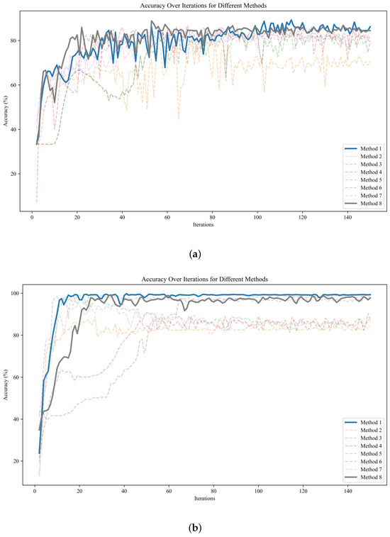 By comparing the unsupervised cross-domain diagnostic iteration accuracies of the eight methods in Cases 1 and 2, it is evident that Method 1 and Method 8, which involves training a neural network with added Gaussian noise, exhibit faster convergence, higher diagnostic accuracy, and greater stability after convergence. The simulation data may be inaccurate for real-world scenarios. However, it is supervised data with a lower-bound guarantee. Adapting samples from the source domain that are too different from the target domain may lead to negative transfers. The proposed method maximally suppresses negative transfers and facilitates positive transfers by characterizing the common features of the source, target, and simulation domains.