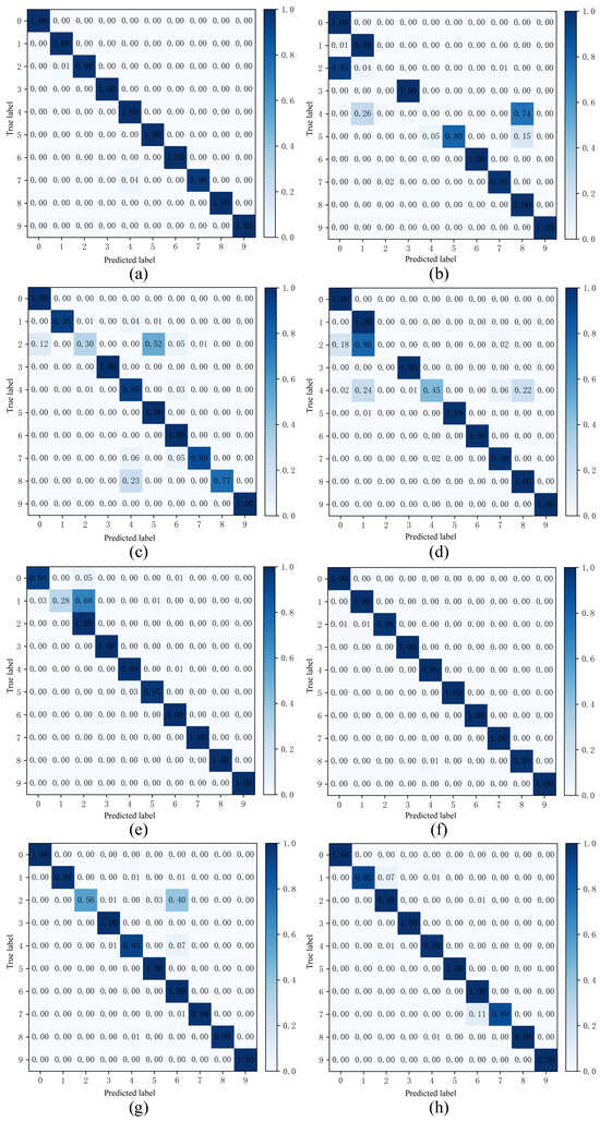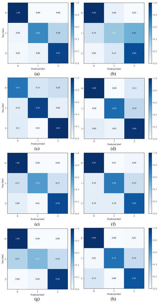 Comparison of Method 1 and Methods 3, 5, 6, and 7 shows that the diagnostic accuracy of the fault categories is improved by the subdomain classifier and the global domain classifier. This is achieved by optimizing the marginal and conditional probability distributions, respectively, and avoiding negative transfers. When comparing Method 7 and Method 3, the accuracy increased from 79.167% to 79.870% in Experiment 1 and from 86.239% to 86.360% in Experiment 2 with the introduction of the MK-MMD metric. This improvement enhances the ability to discriminate inter-domain variability. Method 1 had diagnostic accuracies of 86.667% and 99.435% in both cases, while the highest diagnostic accuracies of the other methods were 83.406% and 99.040%.