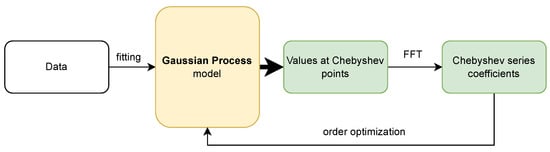 The flow chart visually outlines the structure and flow of the proposed algorithm. It begins with data fitting using a Gaussian process model, followed by generating values at Chebyshev points. The next step involves applying the FFT to these values, leading to the generation of Chebyshev series coefficients. The final stage of the algorithm is the optimization of the order of the series, a crucial step to enhance the algorithm’s efficiency and accuracy.