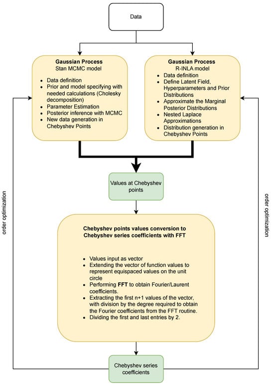 The provided flowchart effectively illustrates the intricate steps and progression of the designated algorithm. It initiates with the phase of data fitting, which is conducted using a Gaussian process model. This model is executed in two distinct manners: firstly, by employing the integrated nested Laplace approximation (INLA) method, and secondly, through the use of the Stan framework with Markov chain Monte Carlo (MCMC) techniques. The primary objective of these generative models is to facilitate the generation of values at specific Chebyshev points. Following this, the algorithm advances to the implementation of the fast Fourier transform (FFT). This transformative process is integrated into the script and is pivotal in deriving the Chebyshev series coefficients from the aforementioned values. Concluding the algorithm’s sequence is the optimization phase, where the series order is meticulously adjusted. This final step is instrumental in elevating the overall efficacy and precision of the algorithm, ensuring optimal performance and accurate outcomes.