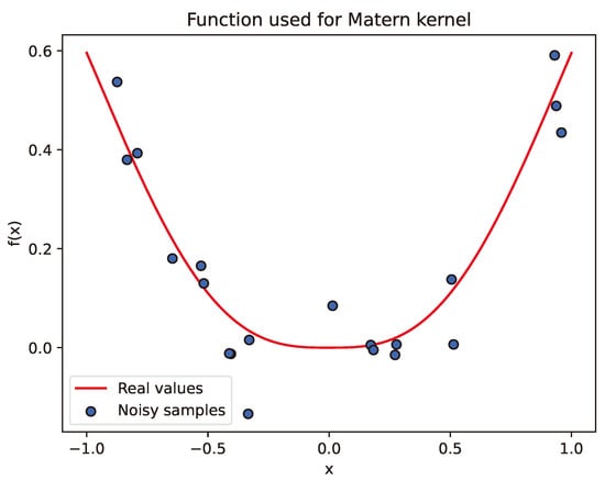 For these defined functions, a small number of points (20 in our experiments) was generated and then joined with random values from a Gaussian distribution (mean ; standard deviation ) to introduce noise. Figure 4 and Figure 5 illustrate the defined functions and the noisy samples generated for them, used in the presented experiment. To simplify subsequent operations with Chebyshev nodes, the domain was set to a range of .