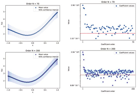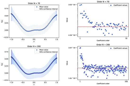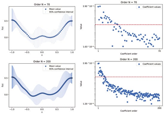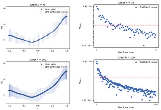 The plots present results for the experiment conducted using the INLA framework method, with a Gaussian process model that employs a modified Matérn kernel, simulating the RBF one. Experiments utilized sample data from selected functions, with random variables set at 70 and 200 Chebyshev nodes. The left plots show the mean values of calculated samples along with the 95% confidence interval derived from the sampled distribution. The right plots illustrate the behavior of Chebyshev series coefficient values relative to their order. A red line indicates the selected threshold for optimization (). We can deduce that all INLA cases behave similarly: initially, the values decrease rapidly, reaching the threshold, and then the downward trend slows down. The computation times for this number of nodes were excellent, conducted within several seconds.
