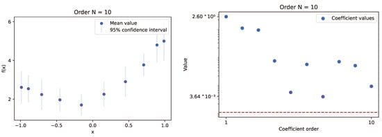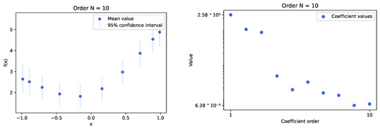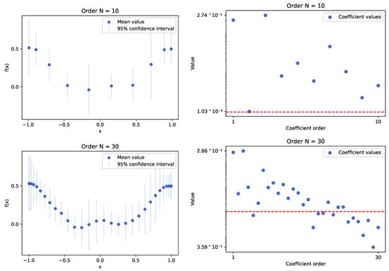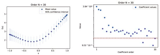 The plots present results for the experiment conducted using the INLA framework method, with a Gaussian process model that employs a modified Matérn kernel, simulating the RBF one. Experiments utilized sample data from a selected function with random variables set at 10 and 30 Chebyshev nodes. The left plots show the mean values of calculated samples along with the 95% confidence interval derived from the sampled distribution. The right plots illustrate the behavior of Chebyshev series coefficient values relative to their order. A red line indicates the selected threshold for optimization (). In this case, the INLA framework mimics the behavior observed in previous cases with low-order coefficients, where values reach the threshold quickly but continue to show a decreasing trend. We can deduce that the required value is likely around the order of 20. The computation times for this number of nodes were excellent, conducted within several seconds.