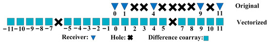 In addition, to improve estimation accuracy, the minimum hole array (MHA) [28], little considered in deep unfolding, is adopted to maximize array degrees of freedom (DOFs). Here, the principle and rationale of different co-arrays for large DOFs are as follows. For a steer vector composed of sensors, if vectorization is adopted for the covariance of received signals, the Kronecker product of steer vectors is yielded, i.e., . Obviously, the difference position set is produced. For a uniformed linear array (ULA) composed of sensors, its position set is , and its difference position set is and is composed of different elements. For MHA composed of sensors, its position set satisfies some constraint [28] so that its difference position set has different elements, resulting in an DOF, which is the maximal DOF in a sparse array [29] Figure 1 shows the case at sensors.
