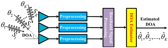 In radar detection and localization and navigation fields, the target direction is vital information in practice. Thus, how to locate signal sources well has been a research focus for more than 40 years. To be specific, array antenna receivers can receive different signals from various directions. Taking far-field radar detection as an example, adjacent antenna sensors have the same phase difference due to the plane electromagnetic wave. When the entire sensor array satisfies the configuration of MHA, a steer vector can be inferred as , where is the direction of the source signal, is the element of the MHA position set , is the wavelength, is the unit distance, and is the number of sensors. For all the sources from different directions , the corresponding steer matrix is yielded as . is vital in DOA estimation because it implies the directions of all the sources based on the entire sensor array composed of sensors. Radio frequency signals are received by an antenna array, whose sensors transfer individually received signals to independent channels, and down conversion is conducted to produce intermediate-frequency signals, i.e., baseband signals. Later, using prior signals to execute matched filtering at time , the receiver can gain the complex reflection factor of all the sources, i.e., and , where is the product of the complex reflection coefficient and Doppler shift. Usually, the radar adopts pulse accumulation to enhance signal processing ability when the echo pulses are in the same coherent processing interval (CPI), in which little fluctuation happens between different originally received signals and processed signals. In other words, sources are motionless, and the processing signals are nearly consistent during a CPI. Overall, the entire process is briefly shown in Figure 2. The received signal at time is modeled as