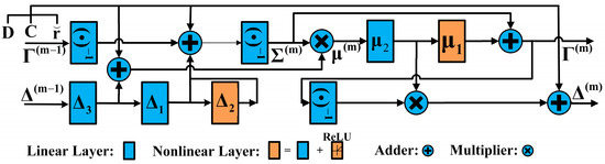 via linear transformation, where denotes the iteration. Remark: In our deep unfolded neural networks, , , , matrix inversion, and matrix transposition with respect to iterative hyperparameters are fitted by linear layers since they are linear transformations, while the nonlinear quadratic terms and are fitted by nonlinear layers. Constant terms are input, and the rest in (23) are realized by adders and multipliers. Specifically, the constructed network architecture is shown in Figure 3 and Figure 4.
