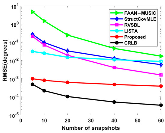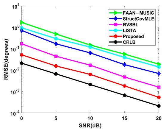 The following simulations focus on the root-mean-square error (RMSE) performance comparison of LISTA, FAAN-MUSIC [33], RVSBL [34], StructCovMLE [35], CRLB [36], and the proposed method. The RMSE is defined as