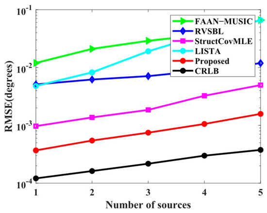 Simulation 4 examines the RMSE performance with respect to the number of sources. Here, all the source angles are uniformly selected from the interval of . Intuitively, in Figure 8, all the algorithms inevitably suffer performance reduction, but the proposed method still outperforms others over the whole range of various numbers of sources. The results indicate that the proposed method has the potential to locate more sources when the angle accuracy is not strictly constrained.