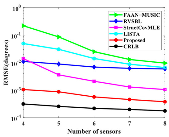 Simulation 5 focuses on the RMSE performance with respect to the number of sensors. Notice that the number of sensors ranges from 4 to 8. The reason for this is that the MUSCI-based method, i.e., FAAN–MUSIC, can only locate maximal sources with sensors. Thus, must be satisfied so that FAAN–MUSIC works normally. In the proposed method, the adopted MHA position set is and contains the maximized eight sensors. In Figure 9, the proposed method achieves the fewest RMSEs. This result can be explained by the fact that the proposed method can inherit the ability of SBL to handle highly underdetermined problems, and the adopted MHA indeed plays an important role in improving estimation accuracy.