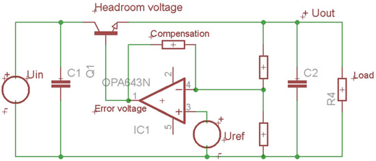 The linear mode of operation for the series-pass unit indicates that it is not intended to work in a fully on or off mode but rather to operate in a state of “partial on”. The pass unit’s necessary level of conductivity is determined by the negative feedback loop [4,5]. In this manner, the output voltage value Uout is sustained.