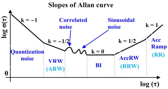The AVAR method assesses the noise coefficients and characteristic noises of inertial sensors, such as acceleration ramp AccR (Rate Ramp RR), velocity random walk VRW (Angle Random Walk ARW), quantization noise, sinusoidal noises, exponentially correlated (Markov) noise, bias instability BI, and acceleration random walk AccRW (Rate Random Walk RRW) [12,13,14,15].