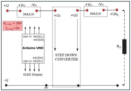 Communication with two INA219 boards was realized by using a I2C interface where I2C addresses were set at 0 × 40 and 0 × 41 according to [18,19]. A measured value of current, voltage and power were sent to the Arduino UNO development board. In the Arduino development board, efficiency values according to (5) and (6) were computed. The efficiency, input/output voltages and currents are shown on the OLED display.