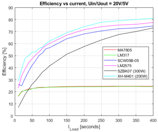 The efficiency of switching (buck) regulators starts at relatively low values, in comparison with the declared (typical or maximal) efficiency in the producers’ datasheets [6,7,8,9,10,11]. According to Figure 9, the lowest efficiency can be seen in the low load current region, where switching regulators SZBK07, LM2575, SCW05B-05, and XH-M401 reach efficiencies of 6.8%, 23%, 26%, and 29%, respectively. The efficiency of these regulators increases rapidly at high load currents and reaches maximal values of 73%, 75%, 78%, and 81%, respectively.