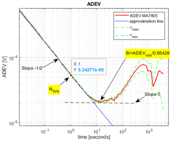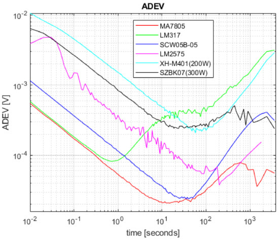 The ADEV of each of the regulator samples has a characteristic Allan curve shape as in [13,16], where it is possible to divide each regulator curve into the following two regions: